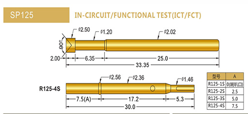SP125探針的針身直徑:2.0mm,頭部直徑:2.5mm,總長:33.35mm,針管材質:黃銅鍍金,彈簧材質:不銹鋼線,鉆孔尺寸:2.4mm,額定電流:5安培,接觸電阻:50毫歐姆,接觸彈力:1N、2N、3N可選,常用的配套有:R125-4S。