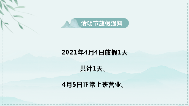 又是一年清明際,又是追思紀(jì)念時(shí)。清明節(jié)是中國(guó)的傳統(tǒng)節(jié)日之一,它不僅是人們祭奠祖先、緬懷先烈的節(jié)日,也是中華民族認(rèn)祖歸宗的紐帶。華榮華全體員工祝大家萬(wàn)事順意,平安健康!關(guān)于2021年“清明節(jié)”放假時(shí)間,我司作出以下安排: