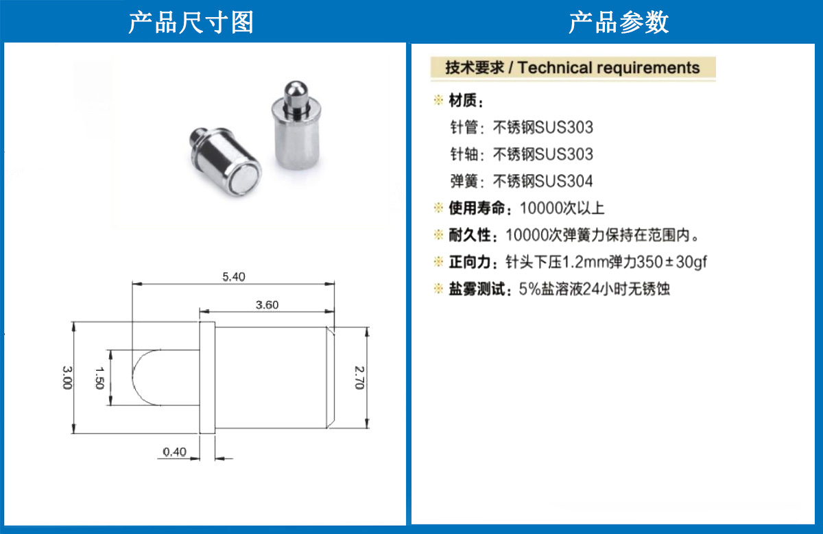 大電流測試探針的種類大電流探針塊產(chǎn)品由數(shù)個彈簧連接件集成于金屬塊上組成,尤其適合測試表面不平或傾斜的待測體。可直接安裝在金屬材料中獲得最大接觸面積扁狀端子大電流測試由于防轉動設計,針頭可以根據(jù)待測體方向而準確定位。當針頭與扁狀端子接觸時,針頭還有20度的扭轉公差。因此在測試過程中不會對待測表面產(chǎn)生任何刮傷損壞采用偏斜球體設計的大電流針金屬球的傾斜式針頭設計可有改善探針針頭和針管內(nèi)壁的電傳導性。當針頭唄壓縮時,彈簧力能將針頭偏向針管內(nèi)壁,增大接觸面。分離式結構設計的大電流探針采用分離式斜面設計的針頭,能最大化的增加針頭與針管內(nèi)壁接觸面積。顯著增大載流量;這樣的特殊設計,能使電流盡可能通過針管管壁流通,將彈簧上流過的電流最小化。連動式結構設計的大電流探針保證最小的內(nèi)阻同時能最大限度的承受大電流。由于是連動式結構,因