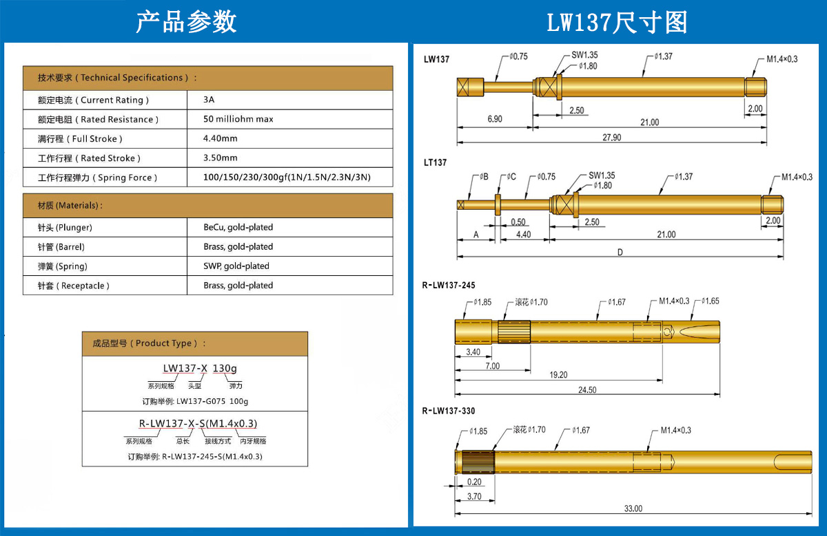 產(chǎn)品介紹:本產(chǎn)品一般用有定向作用的結(jié)束測(cè)試用,產(chǎn)品選用日本SK4 彈簧選用的是琴鋼線。工廠選用的材質(zhì)都是比較硬的,有利于在測(cè)試的時(shí)候過大電流不會(huì)容易損壞。