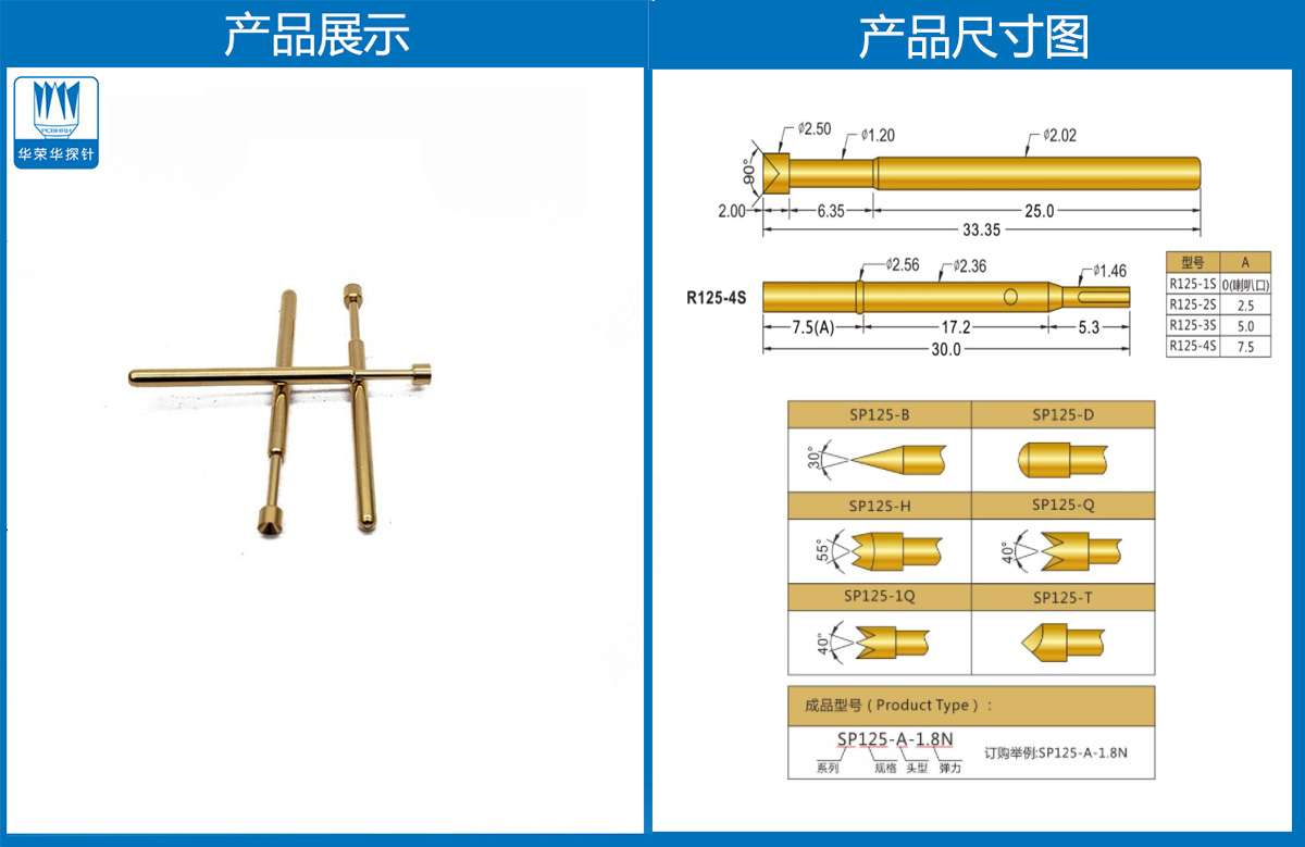 產(chǎn)品簡介:SP125探針、2.02mm測試針、總長33.36mm、彈簧針、測試針、頂針、探針